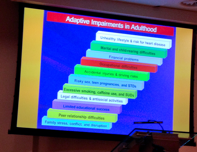 Prof. Barkley liet op basis van gegevens uit veel verschillende bronnen zien welke doordringende gevolgen ADHD kan hebben op het functioneren van adolescenten en volwassenen.Het begint met gebroken gezinnen, problemen met leeftijdsgenoten, afgebroken schoolcarrieres, moeilijkheden met politie en justitie, verslavingsgedrag (nicotine, coffeine, alcohol en andere), risicovol sexueel gedrag, ” accident prone” verkeersgedrag, problemen met werkgevers, financieel problemen, huwelijks- en relatieproblemen en meer risico op ongezonde leefstijl. “Niet levensbedreigend (hoewel?) maar wel levensbedervend” – een citaat van Rob P. Zijn stelling is dat juist vroege behandeling van ADHD met de combinatie van medicatie + psychoeducatie een gunstig effect heeft op de langetermijnprognose. Hiervoor komen steeds meer aanwijzingen uit wetenschappelijk onderzoek.